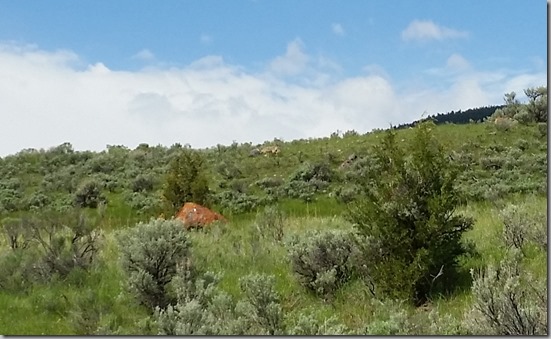 We had just left Mammoth and we saw a baby Elk with its mother. Kim loves babies, so we stopped and looked for a while. Then I noticed something else. There was a wolf or coyote that was checking out the baby also. I got some pictures of the K9, but they are not very good.