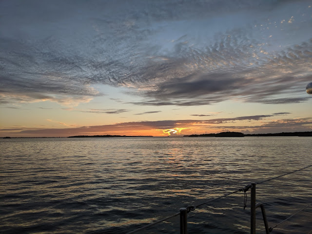 Once we got out in the harbor, the wind picked up to about 10 knots. We had flat water, which means we had a wonderful 3 hour sail down to Bull Key, where we anchored for the night. We enjoyed dinner in the cockpit watching a beautiful sunset. By Monday morning the wind had shifted to the Southeast, which made for a rolling boat and some lost sleep.